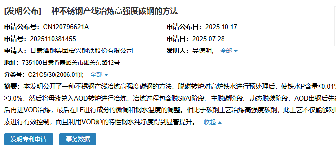 2025年10月17日,甘肅酒鋼集團宏興鋼鐵股份有限公司成功申請一項名為“一種不銹鋼產(chǎn)線冶煉高強度碳鋼的方法”專利,申請公布號為CN120796621A,申請日期為2025年7月28日。